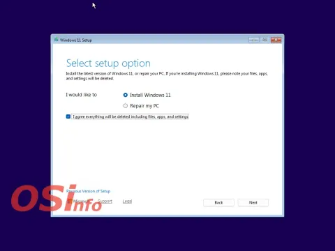 The next window shows the configuration options. If you are installing the system from scratch, select “Install Windows 11” and “I agree to delete everything...” and click “Next.” Please note that all data will be deleted from the disk. Therefore, if you have anything important on the disk, you should first make a backup copy on an external medium.